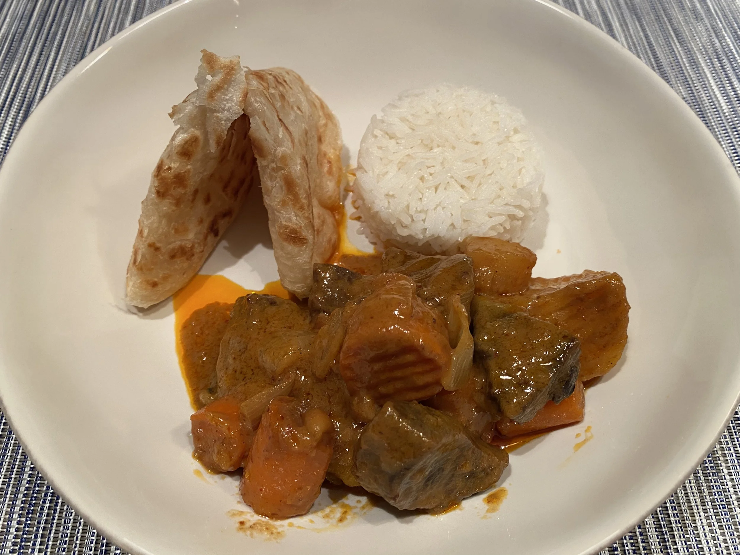 Tender cubes of beef in a mussamun curry and coconut milk stew with carrots, potatoes, onions , roasted peanuts and pineapple chunk.